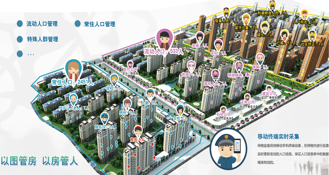 人口信息管理系統(tǒng)通過在社區(qū)、街道安排網(wǎng)絡監(jiān)管員,以公安人口信息為核心,以公民身份證號碼為唯一代碼,進入人口基礎信息的實時采集和更新,內(nèi)容包括住址、政治面貌、家庭成員、不良行為、工作變更記錄、教育經(jīng)歷、人員流動記錄、社會貢獻等39大類200多個小項信息。同時,將城市中的房產(chǎn)和人口信息相關聯(lián),通過不動的房產(chǎn)對流動的人口在地里信息系統(tǒng)上進行定位及管理,實現(xiàn)“以房管人”,實現(xiàn)對城市中的常住人口、流動人口、以及特殊人員的管理,可以服務于社會治安管理部門、衛(wèi)生與計劃生育部門、教育部門、住建部門、房產(chǎn)部門、黨組織等多個部門。■ 綜合查詢:可以查詢并分析各類人口的分布密度和分布規(guī)律,對特殊人群、孤寡老人、育齡婦女等進行準確的跟蹤監(jiān)督,提升社會治安管理水平,實現(xiàn)優(yōu)撫、低保、救災、教育、流動黨員等信息的精準管理。達到以圖管人,以房管人。